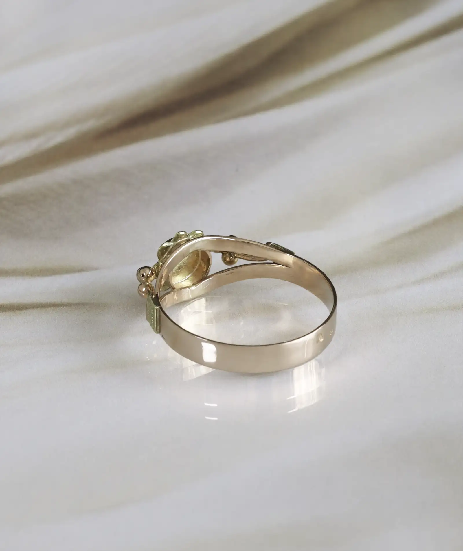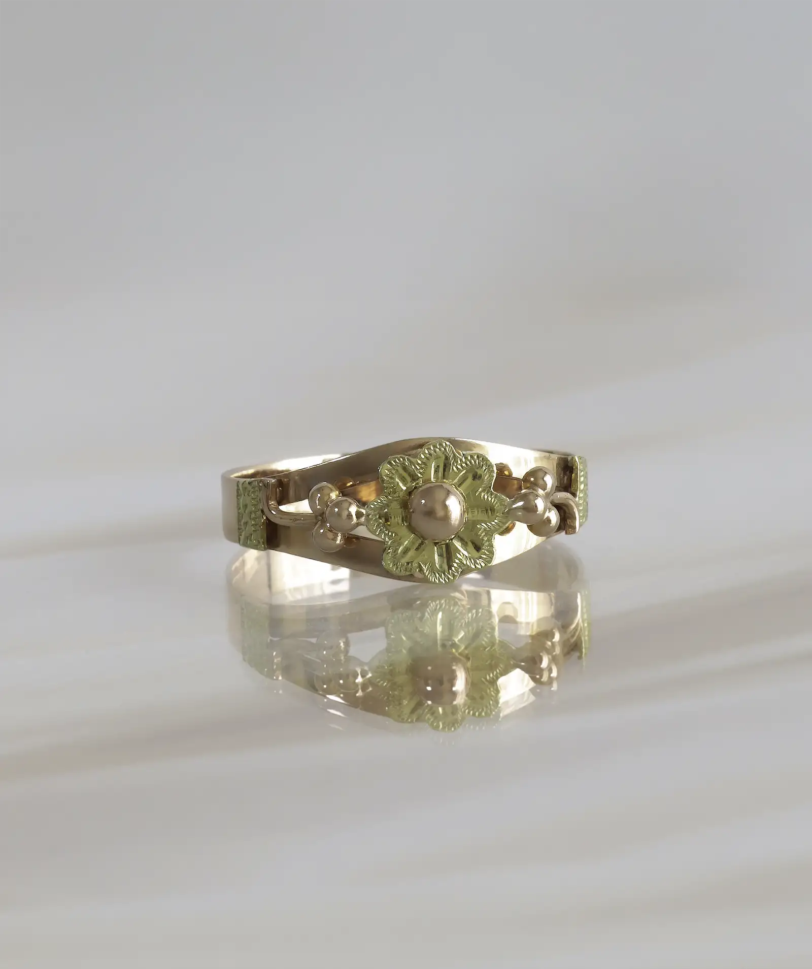 Bague ancienne en or rose et jaune 750 millièmes (18 carats), délicatement ornée d’une fleur ciselée et rehaussée de petites perles d’or.
