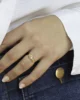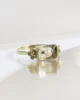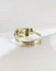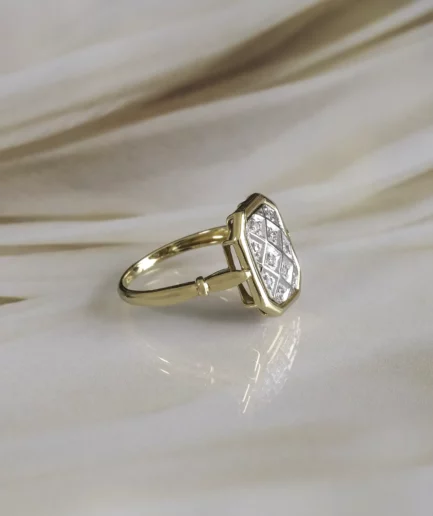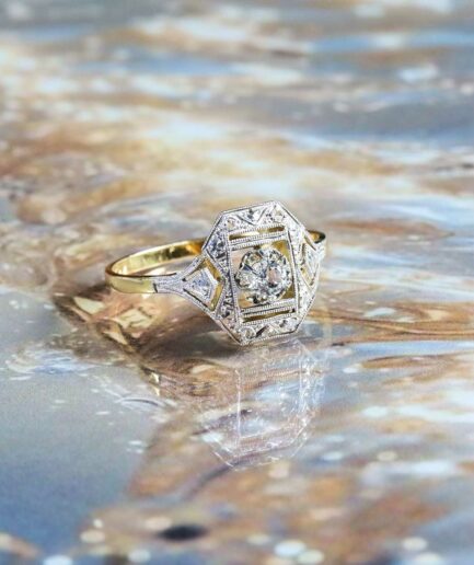 Cette bague vintage séduit par sa monture en or champagne, une teinte raffinée, entre l’or jaune et l’or rose, très caractéristique des bijoux anciens. Elle illustre parfaitement l’alliance entre rigueur et douceur, typique du style joaillier de l’époque. Sa monture en or bi-ton, aux lignes géométriques marquées, met en valeur un rectangle ajouré encadré de deux motifs triangulaires en or blanc.