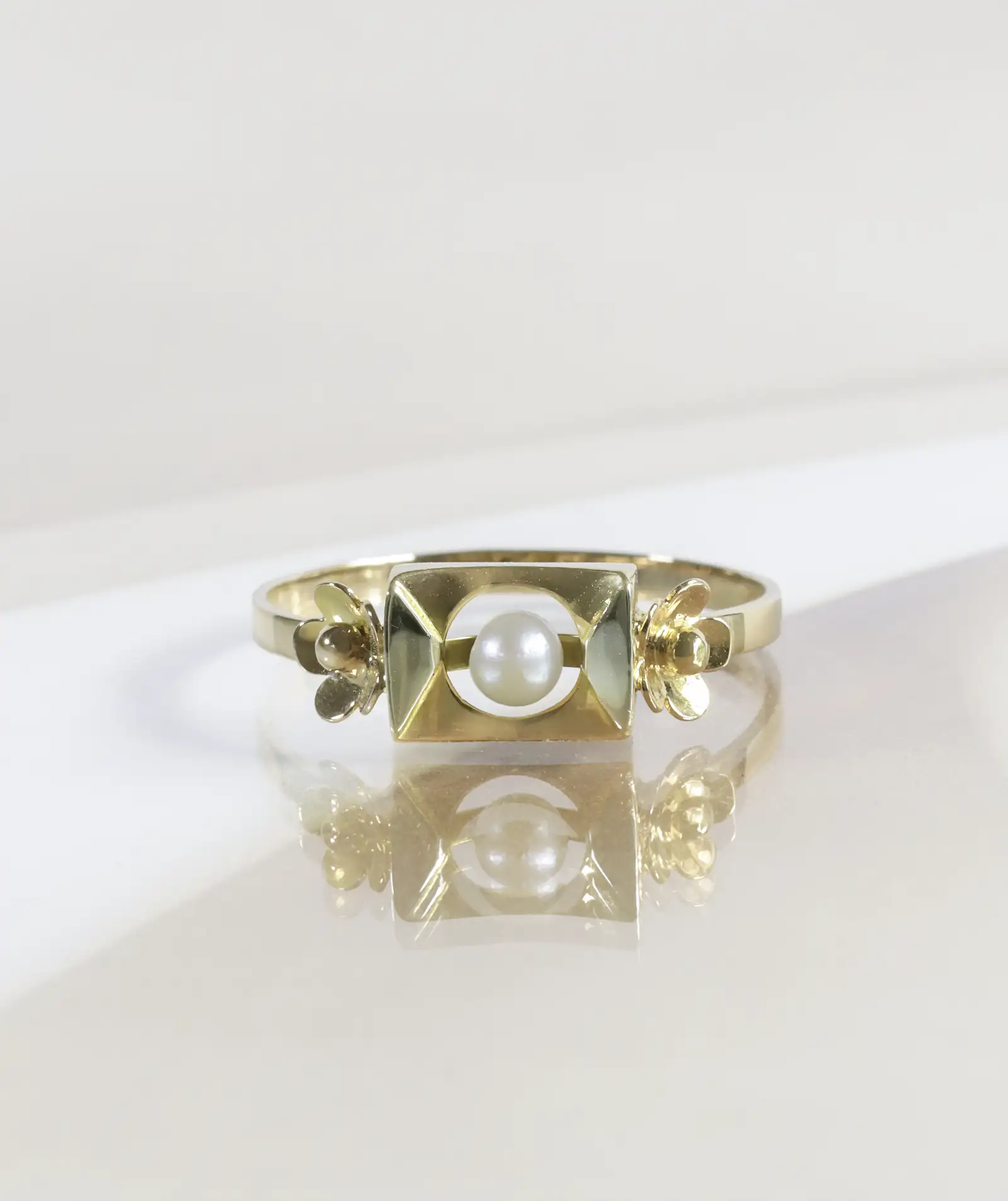 Élégante bague en or deux tons des années 40, au design géométrique orné d’une perle blanche centrale et délicatement soulignée de deux petites fleurs.